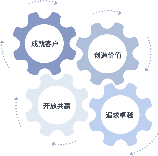 成就客户是一切决策的出发点,,创造价值是衡量所有工作的标准,,追求卓越是我们做事做人的态度,,开放共赢是我们的格局也是最终的结果。。。价值观的齿轮环环相扣,,推动着组织里的每个人不断向前。。。。